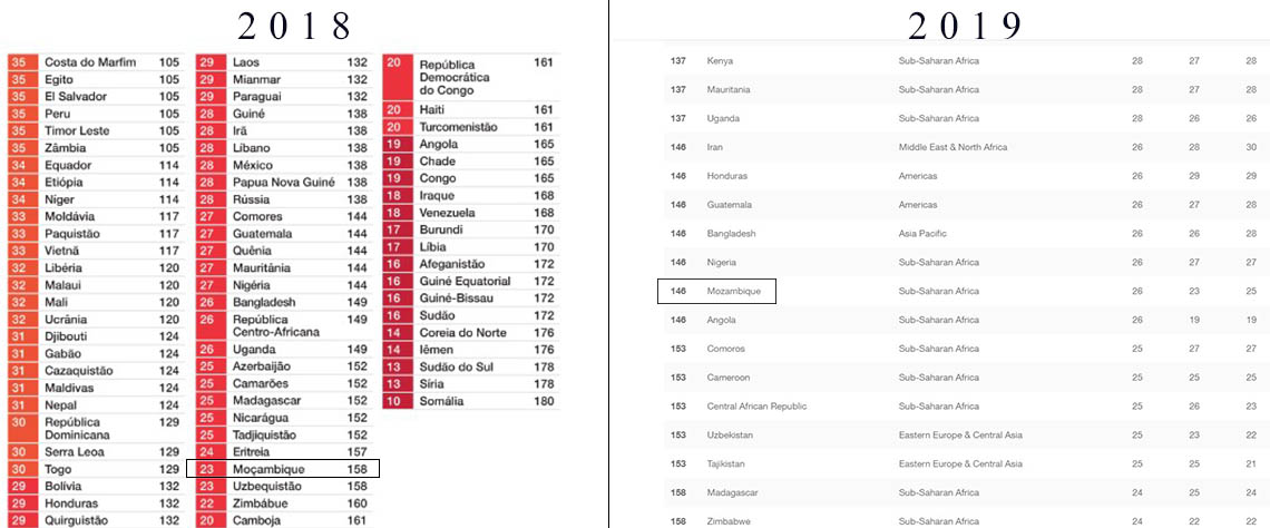 Em 2018, Moçambique havia perdido dois pontos. Ou seja, em 2017, o país tinha 25 pontos e, em 2018, passou a ter 23, uma situação que dava continuidade à derrapagem que se vinha registando desde 2015, quando tinha 31 pontos. Em 2016 passou a ter 27. Com esta subida Moçambique passou a estar na mesma posição que países como Angola, Nigéria, Bangladesh, Guatemala, Honduras e Irão.