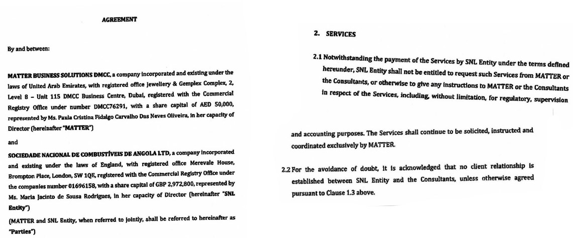 “Não obstante o pagamento dos serviços pela entidade SNL [Sonangol UK] nos termos aqui definidos, a entidade SNL não terá o direito de solicitar tais serviços à Matter ou aos consultores, nem de dar quaisquer instruções à Matter ou aos consultores relativamente aos serviços, incluindo, sem limitação, para fins regulamentares, de supervisão e contabilidade”, lê-se no contrato. “Os serviços deverão continuar a ser solicitados, instruídos e coordenados exclusivamente pela Matter.”