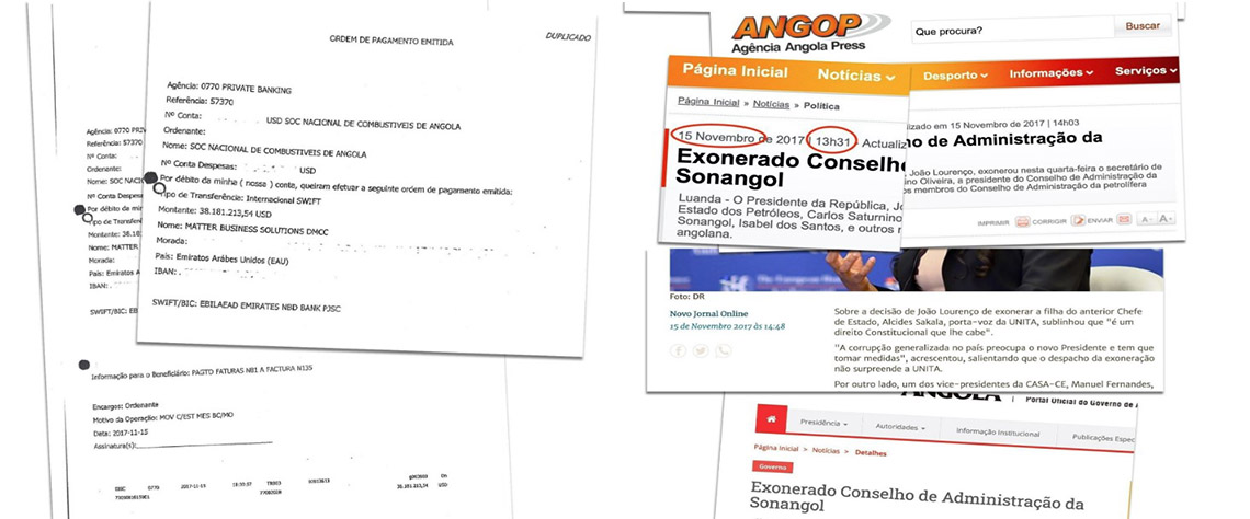 Do dinheiro que foi parar ao Dubai ao longo da segunda metade de 2017, houve 57.831.213,54 dólares que foram pagos em três transferências executadas a 16 de novembro de 2017, já depois de a empresária angolana ter sido demitida publicamente da sua função de presidente da Sonangol, a 15 de novembro, por um decreto do então recém-eleito Presidente da República de Angola, João Lourenço, que substituiu o pai dela no cargo.