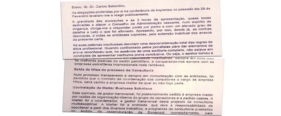 Na carta ao ministro, explicou: “Desde há algum tempo que a forma de relacionamento do senhor administrador para comigo se alterou, na medida em que, na minha qualidade de diretora-geral da Sonangol Limited, declinei assumir certos compromissos contratuais e financeiros.” E alertou o governante: “A retroação da minha exoneração a 30 de agosto, e consequente tomada de posse da minha substituta, não se coaduna de forma alguma com a lei e com as mais elementares práticas de boa gestão e pode facilitar a simulação de atos contratuais que, apesar de nulos ou anuláveis, podem prejudicar o meu bom nome, o meu prestígio profissional e os superiores interesses da Sonangol.”