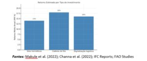 De acordo com estudos realizados em ambientes rurais da África Subsariana, o retorno estimado para investimentos em silos herméticos varia entre 12% a 15%, em frio descentralizado entre 16% a 20%, e em digitalização logística entre 14% a 18%. O gráfico seguinte apresenta a média dos retornos esperados com base em evidência empírica multi-país.”