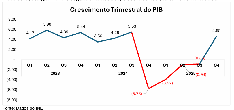 Comecemos pelo crescimento económico. O ano de 2025 foi, na sua totalidade, caracterizado por recessão económica, ainda sob os efeitos primários das manifestações (primeiro e segundo trimestres) e secundários (no terceiro trimestre).