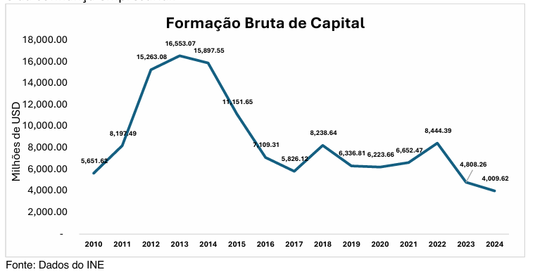 A FBC em 2015, já em queda clara, estava estimada em 11,2 mil milhões de USD. Em 2024, o mesmo agregado estava estimado em 4 mil milhões de USD, menos de metade do valor anterior. Há indicações claras de que este desempenho afectou a confiança empresarial e a economia como um todo. Com isso, a principal base dinamizadora da economia, a indústria transformadora, registou um desinvestimento contínuo.