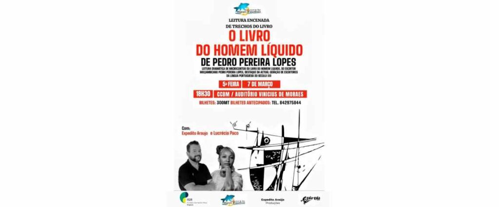 Trechos de microcontos da obra O Livro do Homem Líquido (finalista do Prémio Oceanos, 2022), do premiado escritor moçambicano Pedro Pereira Lopes, serão interpretados pelos actores Expedito Araújo e Lucrécia Paco.