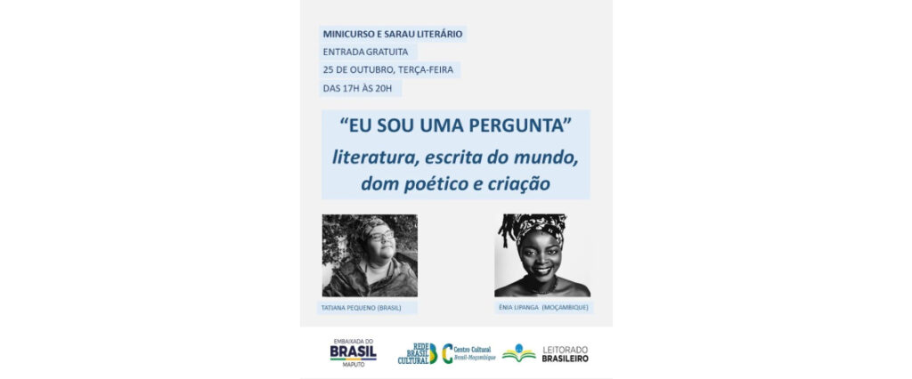 Minidiscurso e sarau literário com Tatiana Pequeno e Énia Lipanga com o tema “Eu sou uma pergunta: literatura, escrita do mundo, dom poético e criação”.