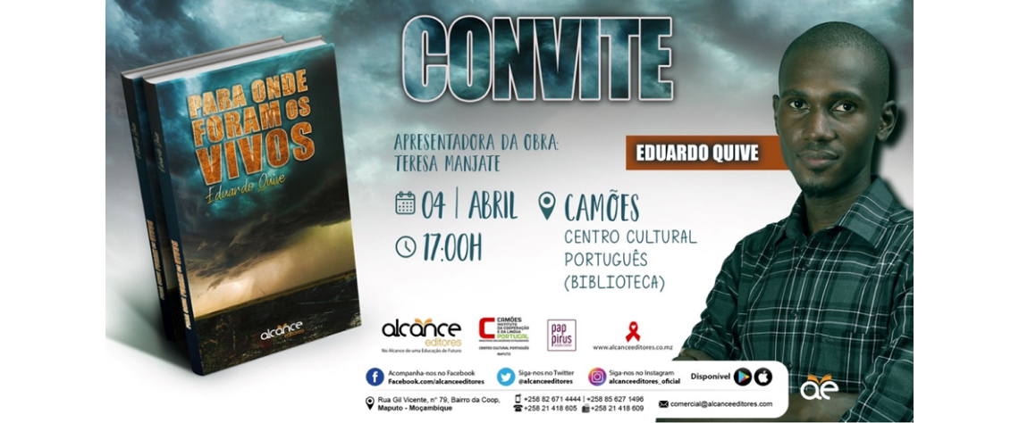 Na próxima terça-feira, dia 4 de Abril, vai ser apresentado publicamente o mais recente livro do autor Eduardo Quive, “Para Onde Foram os Vivos”, com a chancela da Alcance Editores. O livro vai ser apresentado por Teresa Manjate. (04 de Abril, às 17:00 horas no Centro Cultural Português)