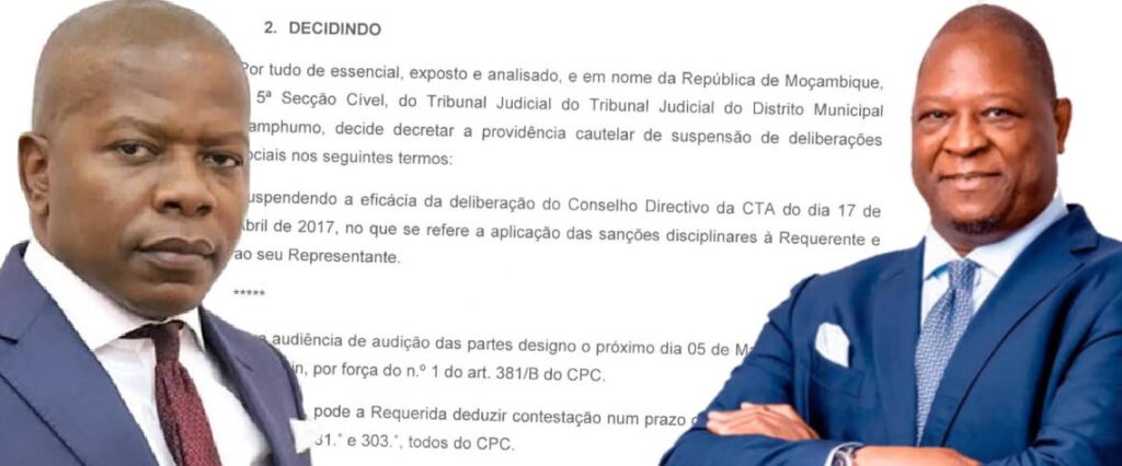 A nova providência cautelar, emitida esta quarta-feira pela 5ª Secção Cível do Tribunal de KaPfumo, suspende “a eficácia da Deliberação do Conselho Directivo da CTA do dia 17 de Abril de 2017 [na verdade é de 2025], no que se refere à aplicação de sanções disciplinares à requerente [Câmara do Comércio de Moçambique] e ao seu representante [Álvaro Massinga]”.