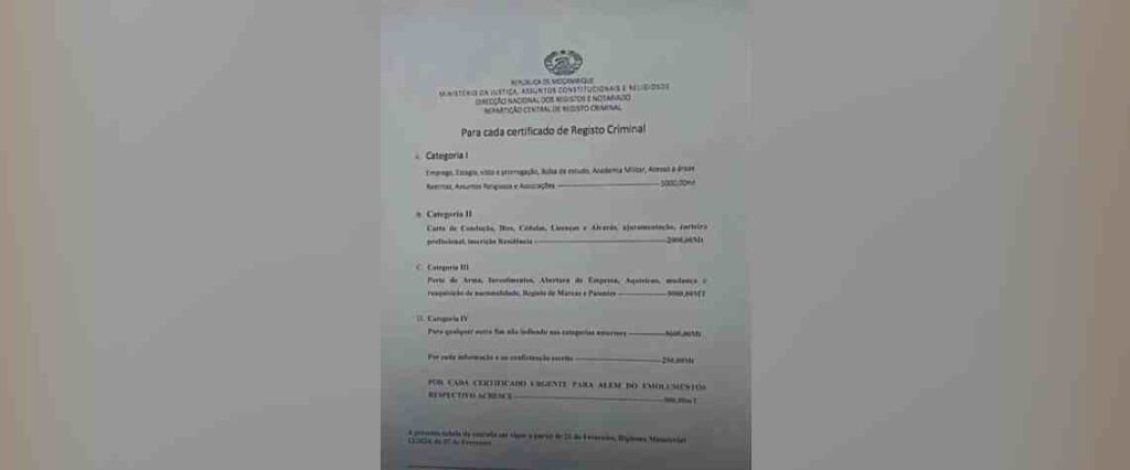 A tabela introduzida ontem, sublinhe-se, refere, por exemplo, que a emissão do Certificado de Registo Criminal custa entre 1.000,00 e 6.100,00 Meticais, enquanto a emissão de títulos de propriedade de veículos automóveis, reboques, máquinas pesadas e aeronaves custa entre 6.000,00 Meticais e 22.000,00 Meticais, subindo para 10.000,00 a 42.000,00 Meticais, caso fosse feito fora do prazo. (Carta)