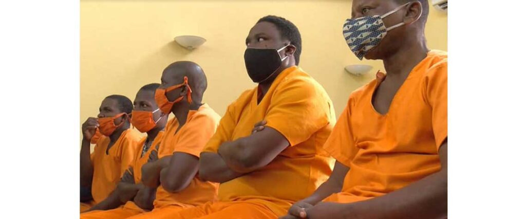 No banco dos réus estão sentados seis arguidos. São eles: Sandura Vasco Ambrósio, António Bauaze, Gabriel Domingo, Eugénio Domingos, Aniva Joaquim e Domingos Marime, acusados do crime de conspiração contra a segurança do Estado. Estes são tidos como os indivíduos que municiam a auto-proclamada Junta Militar, a quem as autoridades policiais imputam autoria moral e material dos ataques armados que têm estado a ter lugar nas províncias de Sofala e Manica, ambas na região centro do país.