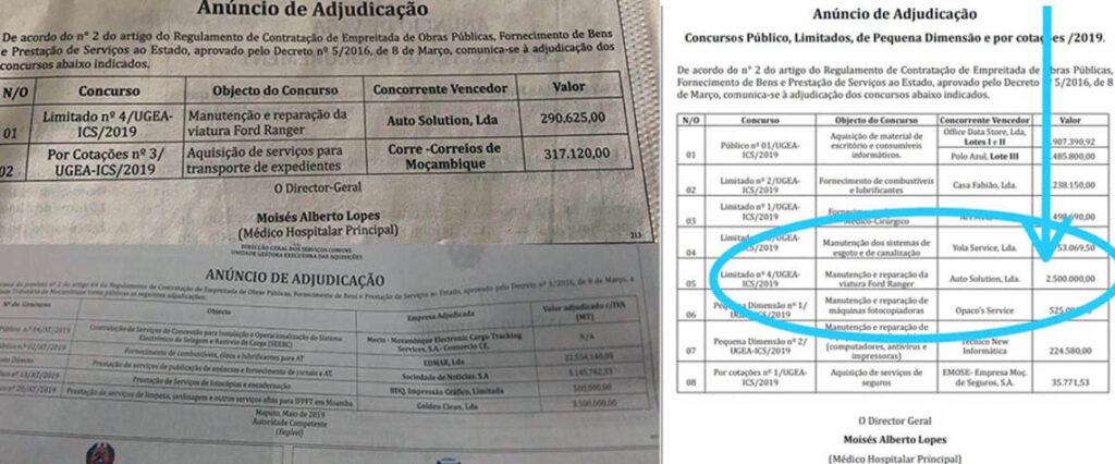 O segundo anúncio, que deixou o país de boca aberta, veio da UGEA do Instituto de Ciências de Saúde de Nampula, que anunciava, a 11 de Maio, a contratação, através de um concurso limitado, dos serviços da empresa Auto Solution Lda. para a reparação e manutenção de uma viatura Ford Ranger, no valor de 2.500.000,00 Mts.
