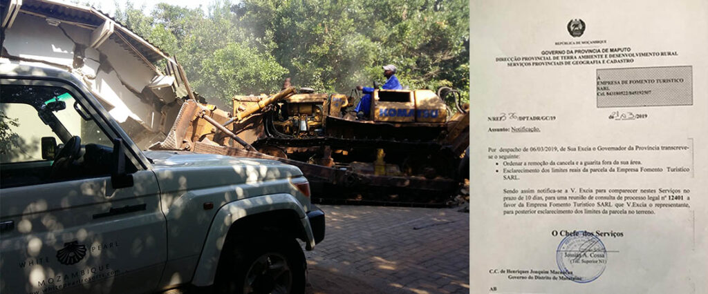 As demolições ocorreram em cumprimento de um Despacho exarado pelo Governador da Província de Maputo, Raimundo Diomba, a 06 de Março último, no qual ordenava a “remoção da cancela e a guarita fora da sua área” e o “esclarecimento dos limites reais da parcela da Empresa Fomento Turístico S.AR.L.”, actual nome de registo da White Pearl Resort.