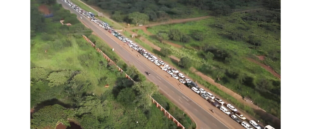 De acordo com o gerente da filial de Newton, Mike Barlow, a fila era constituída por camiões lado a lado na rodovia N4 desde o portão da zona de controlo de fronteira, esperando cruzar a linha fronteiriça para entrar em Moçambique.