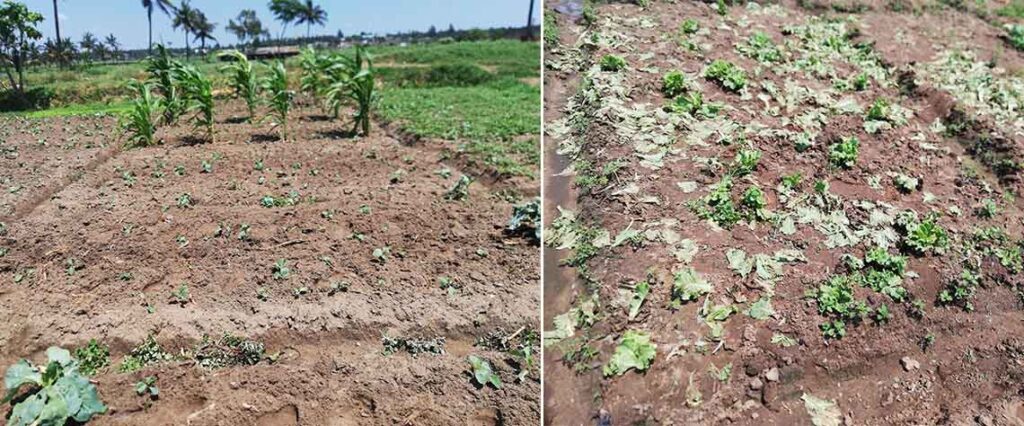 Entre as áreas mais críticas que a “Carta” visitou, pudemos constatar que se destacam as que estão mais próximo à fábrica da 2M, visto que devido às chuvas que caíram nos últimos dias, cortou-se uma via que permitia a transitabilidade dos fornecedores de estrume aos agricultores e facilitava que os carros entrassem mais adiante para transportar os revendedores que abastecem as cidades. Testemunhamos também várias machambas sem produtos e, dos vários locais que visitamos, era visível grande parte de hortícolas queimadas.