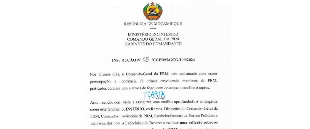 “Nos últimos dias, o Comando-Geral da PRM, tem constatado com maior preocupação, a ocorrência de crimes envolvendo membros da PRM, praticados com recurso a armas de fogo, com destaque para assaltos e raptos”.